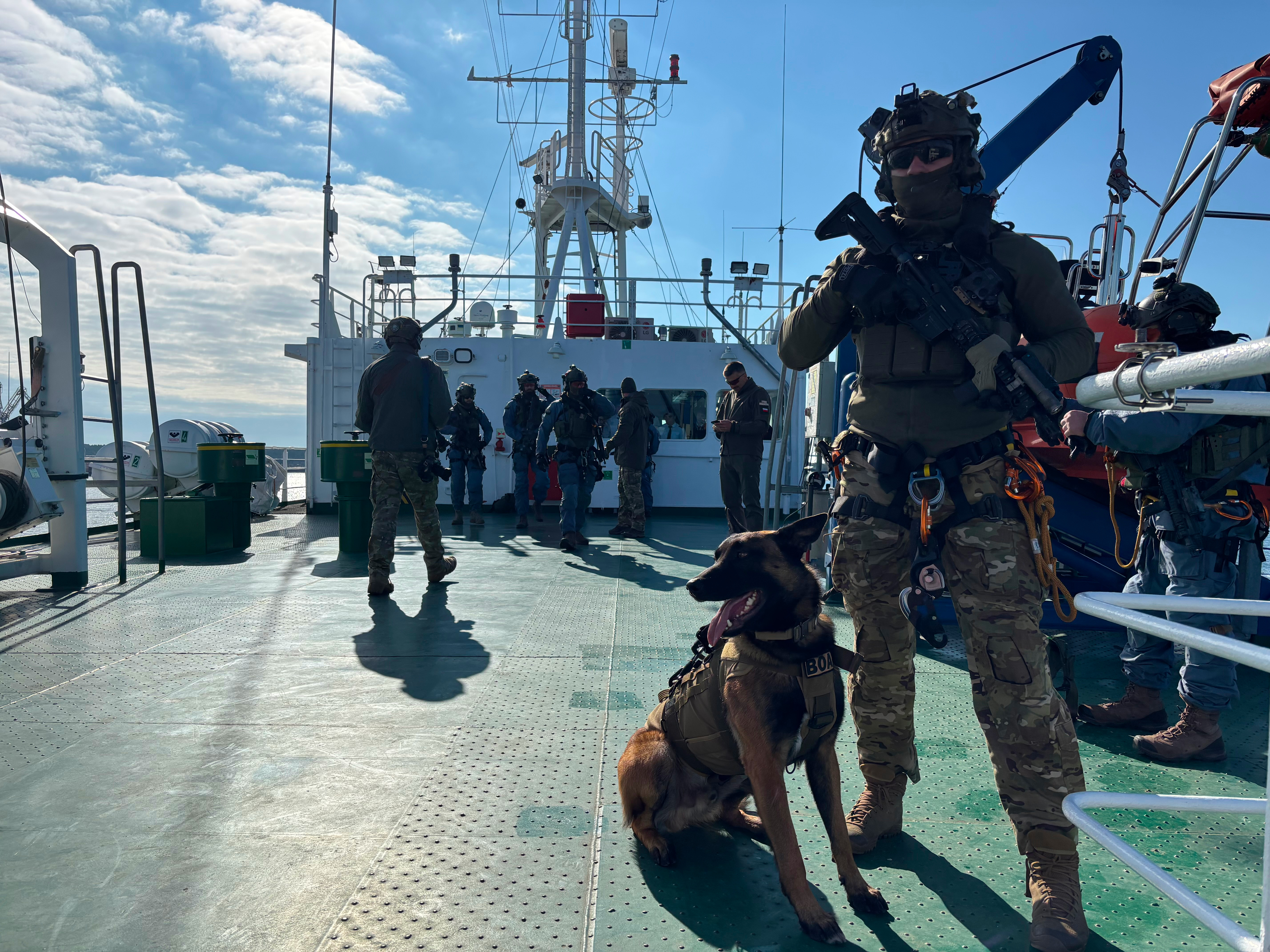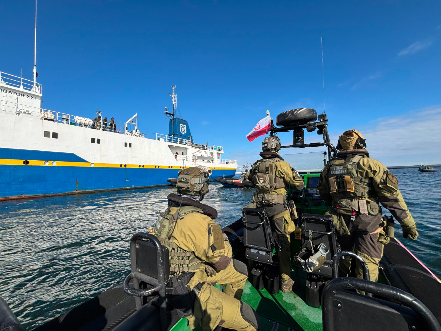 Kulminacyjny moment ćwiczeń obserwowali we wtorek na terenie terminala GAZ SYSTEM w Świnoujściu: Marcin Kierwiński Minister Spraw Wewnętrznych i Administracji, Komendant Główny Straży Granicznej gen. dyw. SG Robert Bagan i z ramienia MOSG kontradm. SG Andrzej Prokopski Komendant MOSG.
