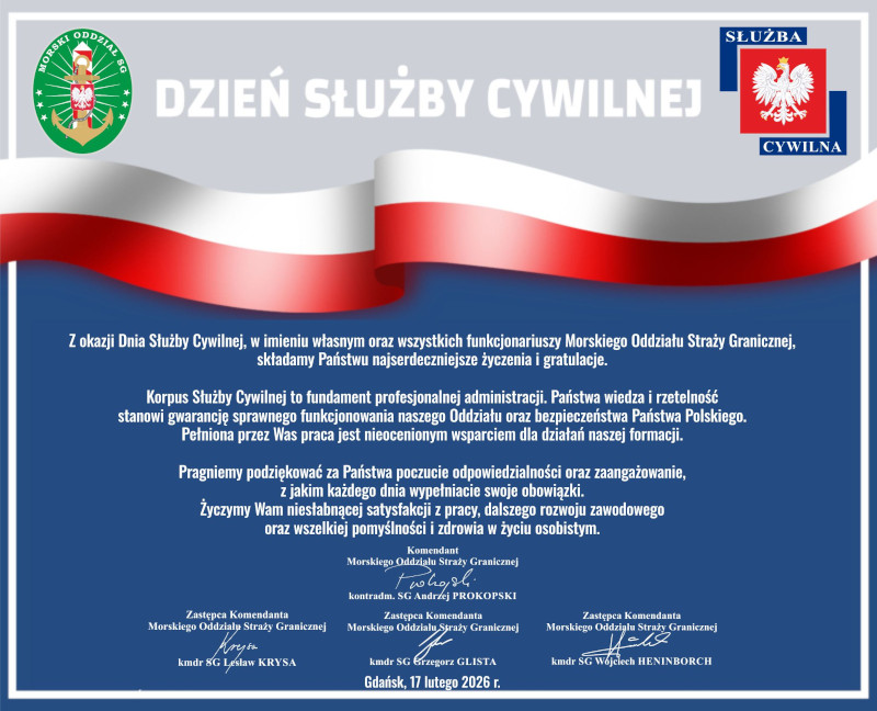 W rocznicę uchwalenia przez Sejm II Rzeczypospolitej ustawy o państwowej służbie cywilnej 17 lutego obchodzony jest w Polsce Dzień Służby Cywilnej. Z tej okazji najserdeczniejsze życzenia i gratulacje składają Pracownikom Komendanci Morskiego Oddziału Straży Granicznej.
