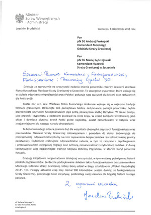 Nadaniem Placówce SG w Szczecinie imienia por. rez. kaw. Wacława Piotra Russockiego Straż Graniczna i Instytut Pamięci Narodowej chcą przypomnieć mieszkańcom Szczecina postać polskiego prawnika i dyplomaty, konsula RP w Szczecinie w latach 1938-39, który w trudnym okresie niemieckich przygotowań do wojny jako jeden z pierwszych starł się z niemieckim aparatem policyjno-sądowym, stając w obronie polskiego obywatela. Wacław Piotr Russocki w wyniku niemieckich działań zmuszony został do opuszczenia Szczecina i po powrocie do kraju, jako wyróżniający się oficer, został zmobilizowany do 1. Pułku Kawalerii Korpusu Ochrony Pogranicza. Jego 36-letnie życie zakończyło się tragicznie. W 1940 roku został zamordowany w Katyniu.