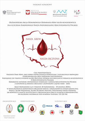 Akcję, której organizatorem jest Komendant Główny Straży Granicznej, po raz kolejny objął honorowym patronatem Minister Spraw Wewnętrznych i Administracji, Minister Sprawiedliwości, Minister Zdrowia i Sekretarz Stanu - Szef Krajowej Administracji Skarbowej. Krew można oddawać od 20 października do 20 grudnia w poszczególnych jednostkach organizacyjnych oraz szkoleniowych Straży Granicznej, Policji, Służby Więziennej, Służby Ochrony Państwa, Straży Miejskiej oraz w innych instytucjach, organizacjach i w punktach krwiodawstwa.