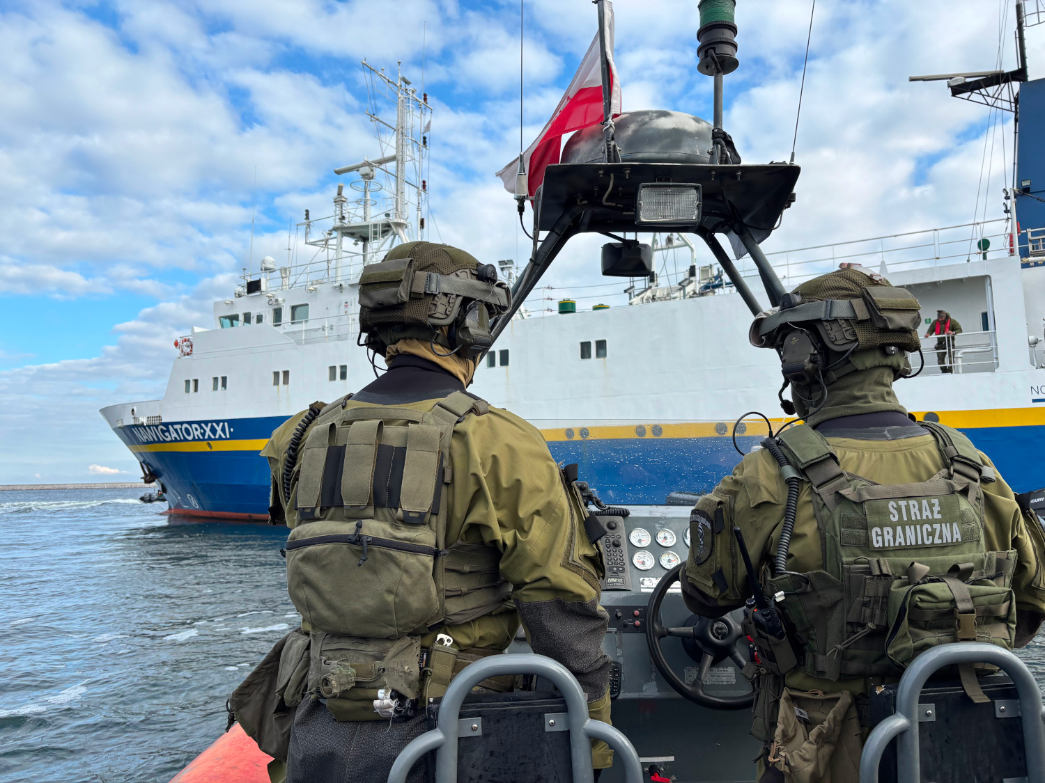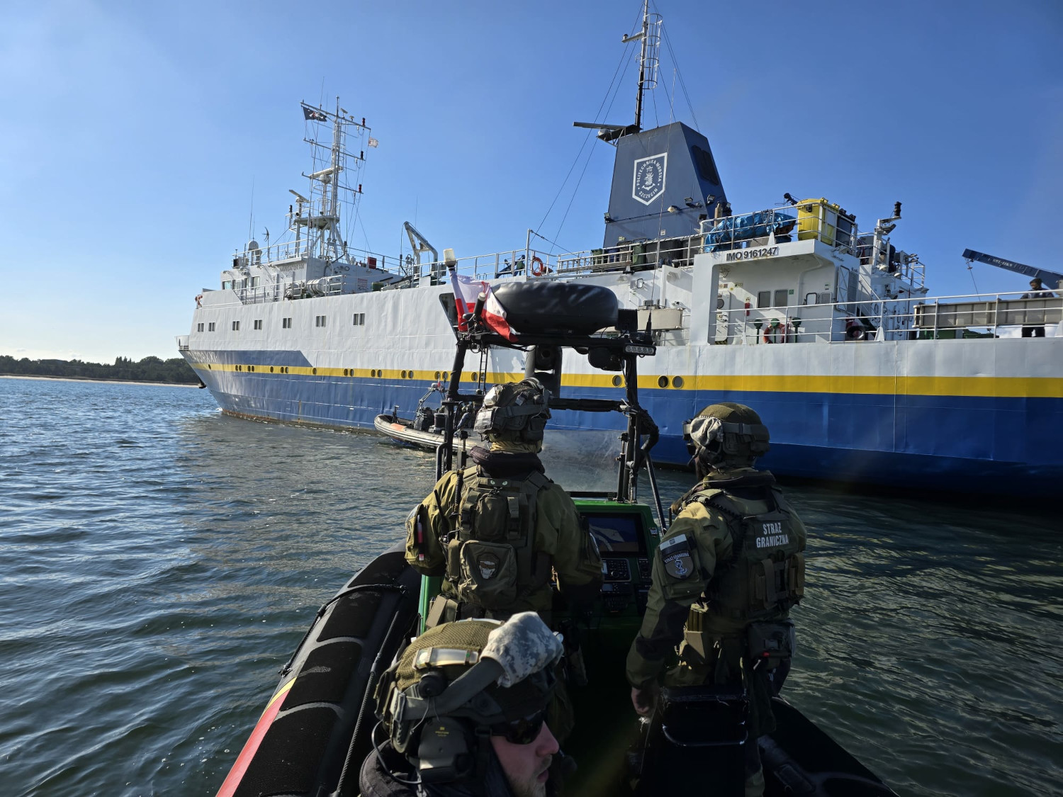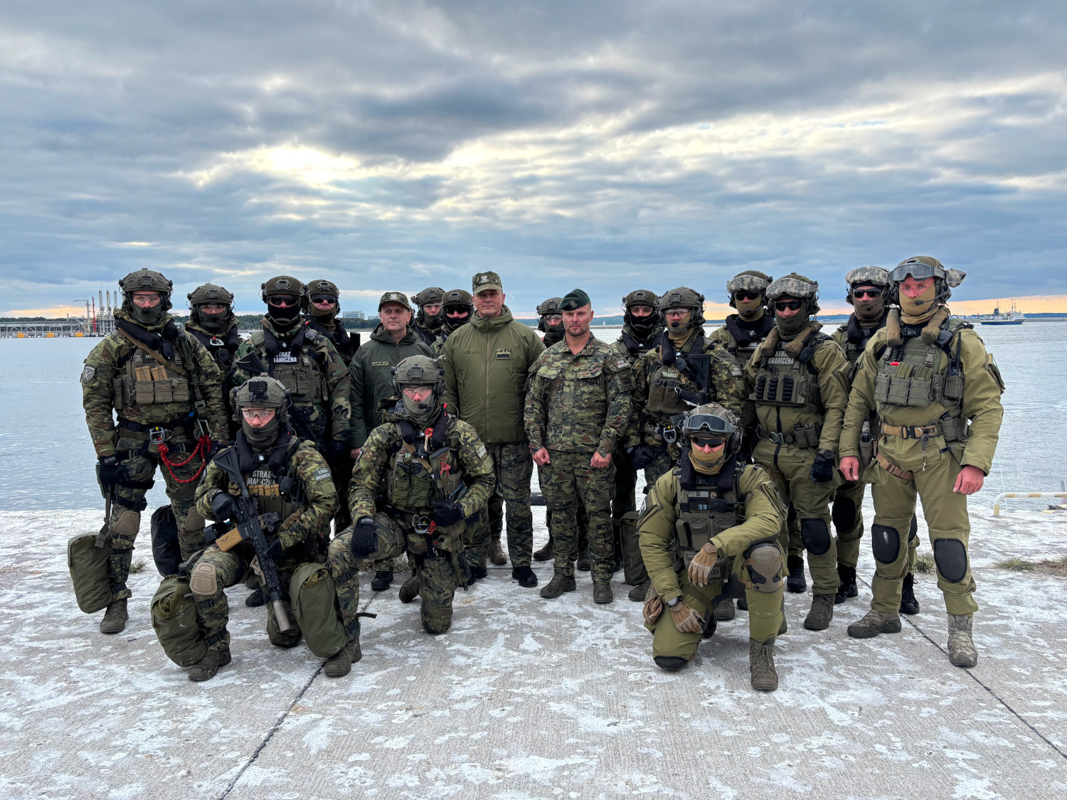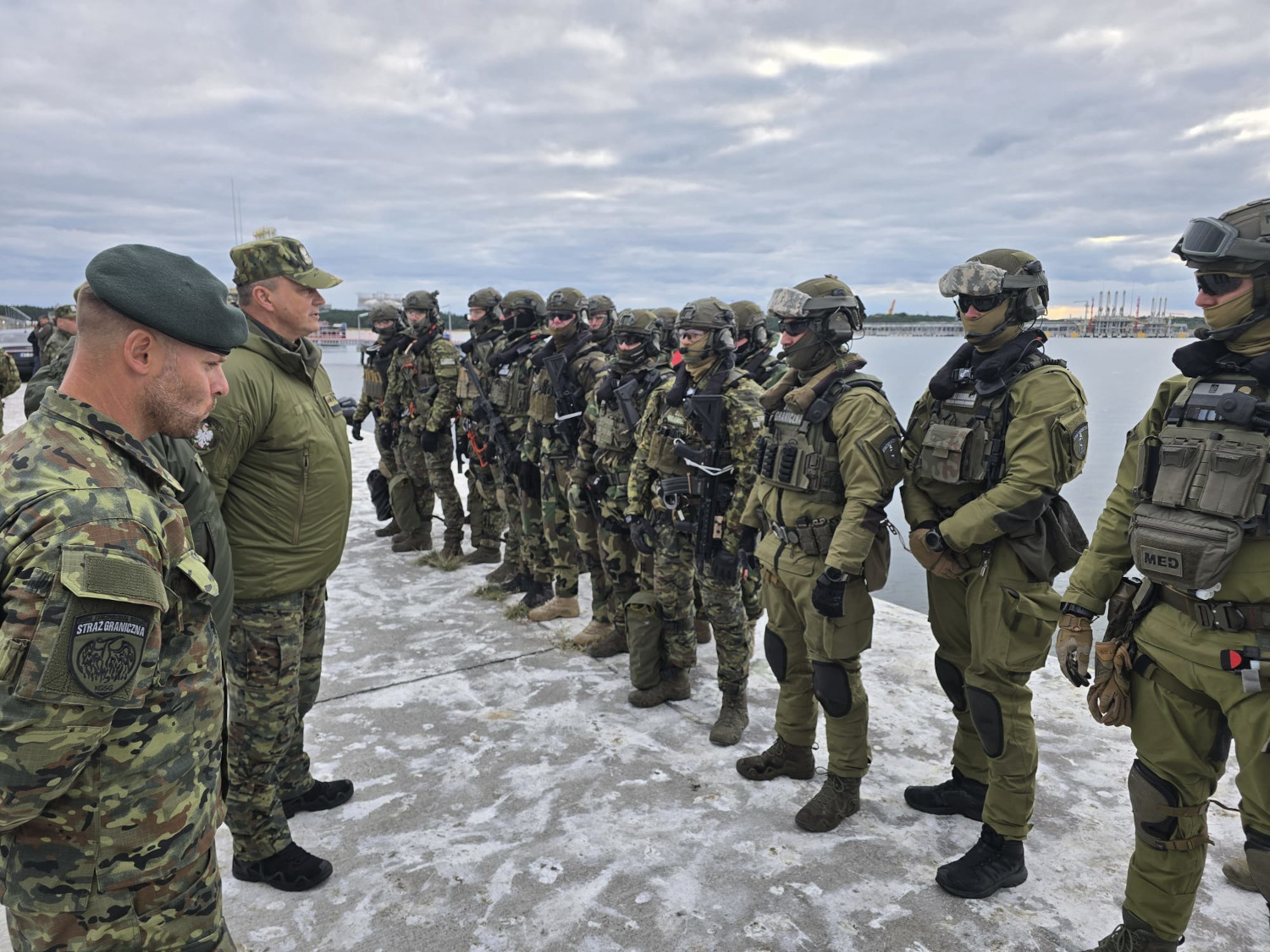 Kulminacyjny moment ćwiczeń obserwowali we wtorek na terenie terminala GAZ SYSTEM w Świnoujściu: Marcin Kierwiński Minister Spraw Wewnętrznych i Administracji, Komendant Główny Straży Granicznej gen. dyw. SG Robert Bagan i z ramienia MOSG kontradm. SG Andrzej Prokopski Komendant MOSG.