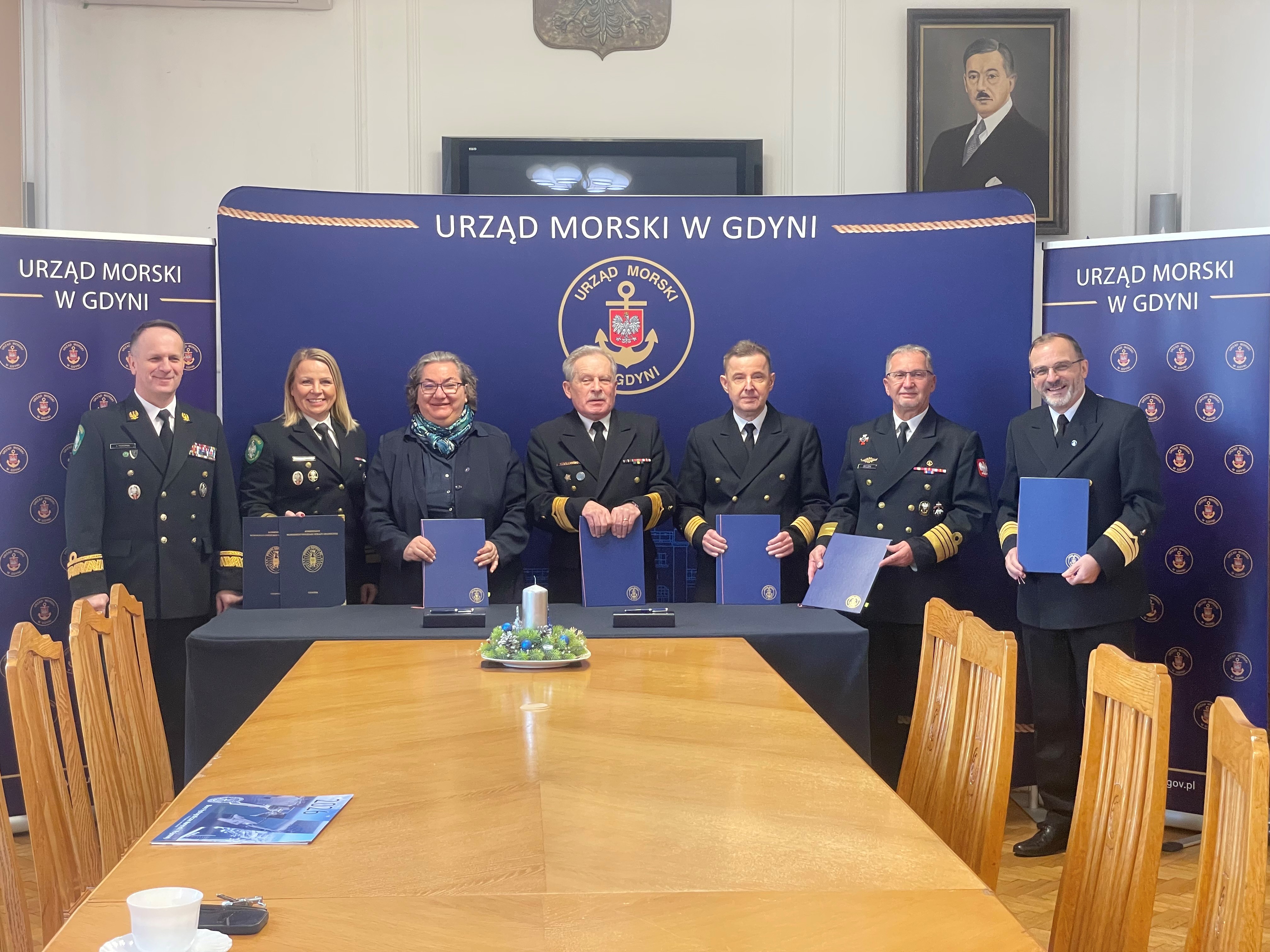 Porozumienia podpisali: kontradm. SG Andrzej Prokopski Komendant MOSG, Przemysław Lenard Zastępca Dyrektora Urzędu Morskiego w Szczecinie i ze strony Urzędu Morskiego w Gdyni Dyrektor Anna Stelmaszyk-Świerczyńska.