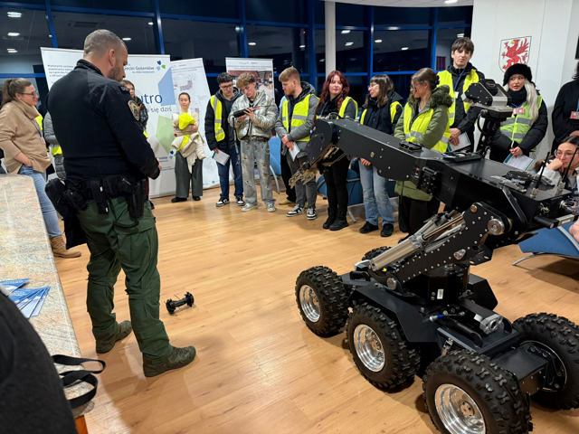 Lotnicze przejście graniczne w Szczecinie-Goleniowie odwiedzili studenci III roku Uniwersytetu Szczecińskiego. Funkcjonariusze Grupy Bezpieczeństwa Lotów i Grupy Służby Granicznej zapoznali gości z zadaniami realizowanymi na lotnisku, w tym z zapewnieniem bezpieczeństwa, działaniami minersko-pirotechnicznymi oraz kontrolą graniczną. Zaprezentowano specjalistyczny sprzęt, m.in. robota i kombinezon pirotechniczny. Studenci otrzymali materiały promocyjne i informacje o naborze do służby. Podczas prelekcji przypomniano również zasady bezpieczeństwa na lotnisku, m.in. o niepozostawianiu bagażu bez opieki, nieżartowaniu o materiałach niebezpiecznych oraz nieprzyjmowaniu rzeczy do przewozu od obcych osób.